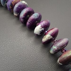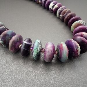 Hand-strung with enhanced natural stone rondelles, each bead carries its own marbling, veining, and organic variation. The palette softly echoes what is often admired as Purple Rain Jasper — that moody, mineral-rich blend beloved in bohemian and artisan jewelry — while remaining honestly described as enhanced natural stone.