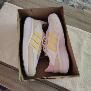 Brand New Adidas Originals Run 70s Sneaker Size Women's 11 in white/Cream/ Yellow/ Pink combo. Perfect for all your gym activities or can be styled casual for all your daily activities.
