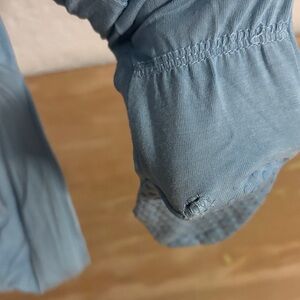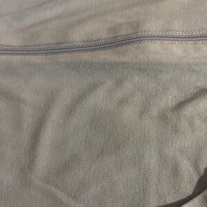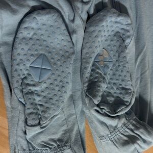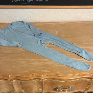 •Stream Zipper Footie. Good used condition. Light wash wear (pilling). Unfortunately the grips stuck together in the wash and when pulled apart the grippy peeled. Still plenty grippy. One small hole on the left heal that could probably be fixed.