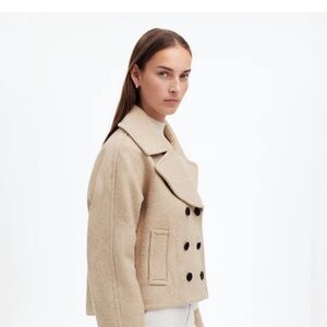 Chic cream peacoat with black buttons. Perfect for a sophisticated look.