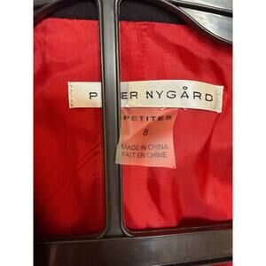 This Peter Nygard Red 2 Pc Suit with Black Trim in size 8P is a stylish and festive option for a holiday party or special occasion. The jacket features long sleeves, a single-breasted design, and a notch lapel style, while the pants complete the set. The suit is designed for a business occasion but can also be worn for a holiday-themed event, making it a versatile and eye-catching addition to any woman's wardrobe. The suit is made with quality materials and should be dry cleaned to maintain its appearance.