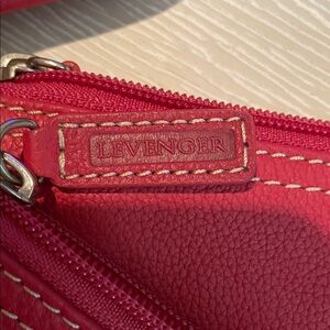 Stylish red crossbody bag by Levenger. Features a sleek design and adjustable strap. Ideal for everyday use.
