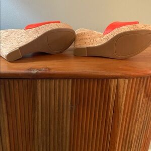 Bright orange straps with cork wedge. Stylish and eye-catching. Perfect for summer outings. Ladies size 8 1/2. Never worn outside. Like new