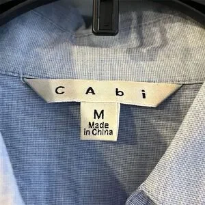 Keywords: CAbi, women's tunic, button-up, blue tunic, casual wear, collared neckline, long sleeve, pintucked, tuxedo-style, cotton tunic, machine washable, pre-owned, excellent condition, versatile top, regular fit.