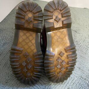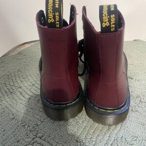 Stylish burgundy combat boots. Durable leather upper. Iconic yellow stitching. Comfortable and rugged design.