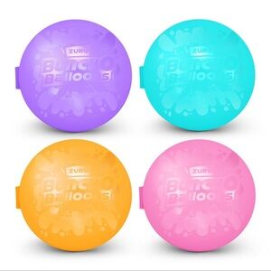 Set of four reusable water balloons by Zuru. Includes purple, pink, orange, and blue balloons. Perfect for outdoor fun.