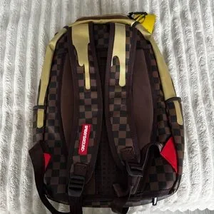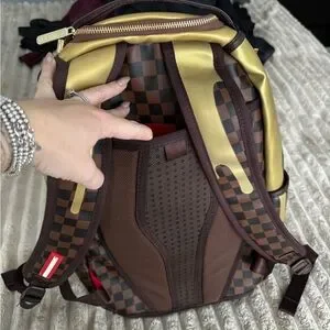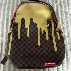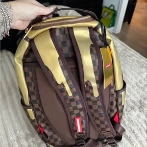 Stylish backpack with a gold drip design over a brown checkered pattern. Perfect for making a statement.