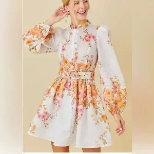 Mainstrip Amy Floral Print Dress Long Sleeve Holiday Mini White Medium No Belt