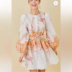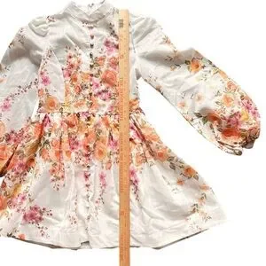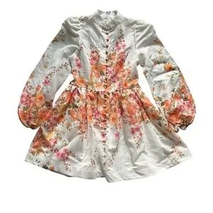 Beautiful Mainstrip “Amy” Floral Print Dress in size Medium. White base with vibrant orange, pink, and peach floral print. Long balloon sleeves, covered fabric buttons, a high neckline, and a flattering A-line silhouette. Perfect for holidays, Thanksgiving gatherings, Christmas events, winter photos, and dressier seasonal occasions.