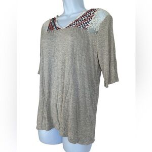 Cute and comfy Daytrip top featuring cream lace shoulders and colorful embroidered detailing along the neckline. Soft heather-gray fabric with a relaxed, flowy fit and 3/4 sleeves. Perfect for casual, boho, or layered looks.