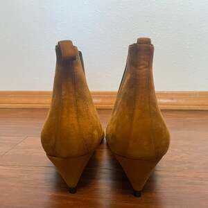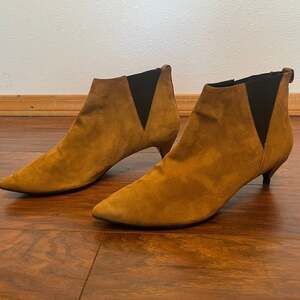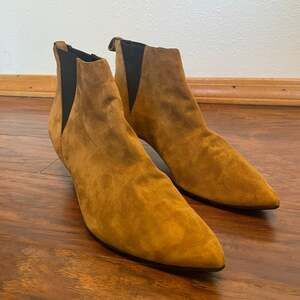 Pierre Hardy Brown Suede Chelsea Boots, Women's Size 10 / EU 41 — Sophisticated ankle boots featuring a pointed toe and kitten heel. Crafted from premium tan kid leather suede with tonal elastic gussets for easy wear. These luxury boots offer a sleek silhouette perfect for semi-formal or chic daily wear.