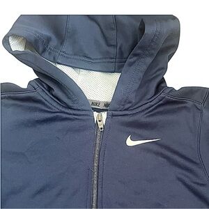 Stylish Nike hoodie for kids. Deep blue color with front zipper. Features iconic logo on chest.Fleeced inside and meshed lining hood.