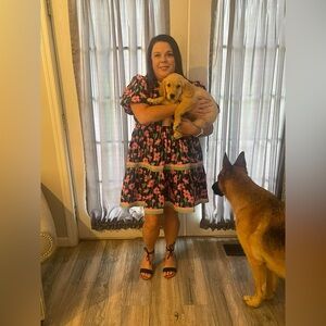 Boutique brand Entro…Loved this dress on the hanger & even more once I got it on!! So flattering! It is a size Large. This dress is short sleeve and a lining in the sleeves, elastic, and a puff style to them! It is looks like it has ribbon on it, but it’s just material made to look that way. Colors are black, pink, & green! It has pockets! I only wore this dress twice to church for a couple of hours each time. I put that it was “good” condition instead of like new, only because after washing, the material wasn’t as crisp as when it was new. Comes from a smoke free home!