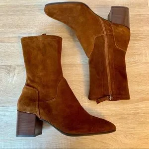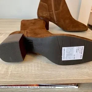 Elegant suede ankle boots. Rich brown color. Sturdy block heel. Side zipper closure.