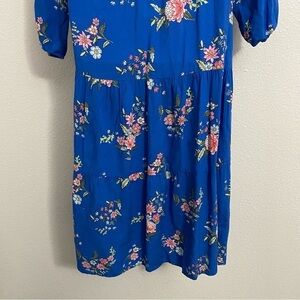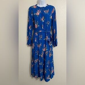 Gorgeous blue long sleeve midi dress with pink floral pattern. Buttoned keyhole neckline that can be unbuttoned is desired. Ribbon blet around the waist that can be tied in the front, back, or side. Long sleeves with elastic cuffs. Perfect prairie style dress for any occasion.