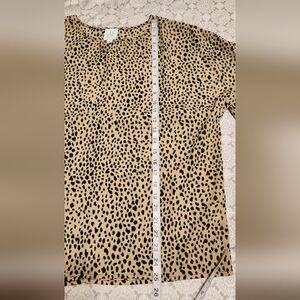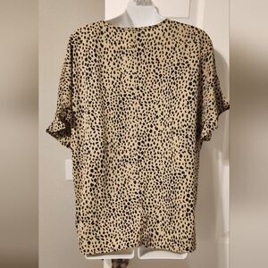 womens sz Small EUC Shop The Mint "All I Ask" Taupe brown leopard spotted ruffle top with round neckline and no stretch. measurements are approximate taken laying flat