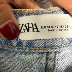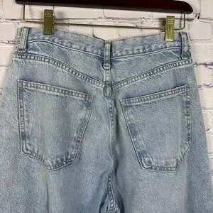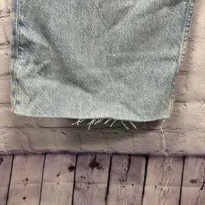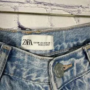 Zara TRF Mid-Rise Wide Leg Jeans in a light blue wash, size USA 6. These stylish jeans feature a comfortable mid-rise fit and a modern wide-leg silhouette. Made of durable denim, they are perfect for everyday wear and can be dressed up or down. The hem has a raw, frayed edge, adding a trendy detail. Excellent pre-owned condition, with no visible rips, tears, or stains. Hip to hip 14”. Inseam 33”