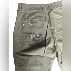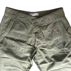Stylish green cargo pants featuring colorful paint splatter design. Unique and trendy look. Size 4. Waist laying flat is 13 inches. Front rise is 10 inches. Inseam is 25 inches. 100% cotton. #zara #cargopants #cropped #womens #pants #womenspants #colorful