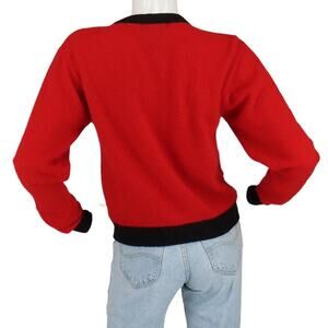 Embrace a symphony of style with this red cardigan, where preppy meets edge, softness dances with boldness, angora weaves tales of comfort, and every button echoes the glam rock spirit, a vintage statement for the modern sophisticate, infusing everyday looks with a touch of 80s splendor