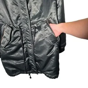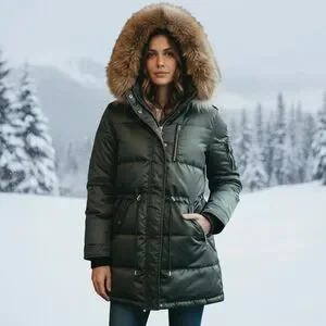 This coat features a real natural raccoon fur trimmed hood, warm 90% duck down fill, and a flattering long silhouette with adjustable waist drawstring. Perfect for cold Canadian winters while staying sleek and stylish.