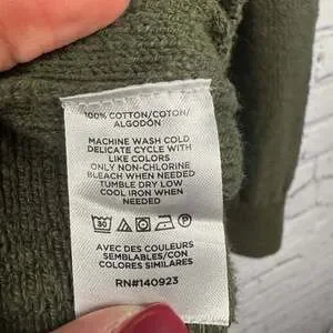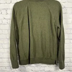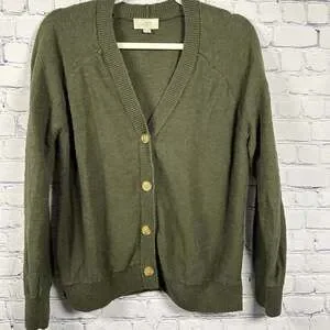 LOFT Drop Shoulder Cardigan, Olive Green, Women's Size Large. This cozy cardigan features a relaxed fit with drop shoulders and a classic V-neck. Made from 100% cotton, it's perfect for layering. Excellent pre-owned condition with no visible flaws. Cottagecore grandma sweater