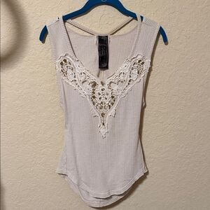 Elegant tank with intricate lace design. Soft cream color. Perfect for layering.