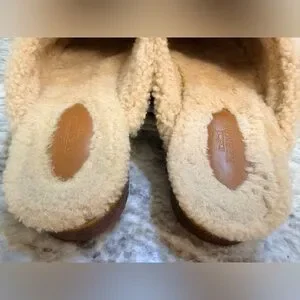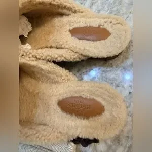Gently used and in very good condition. Moderate wear on the bottom soles consistent with normal use. Very light, barely noticeable surface markings. Natural wrinkling at the front and lightly pressed shearling, as expected with wear.