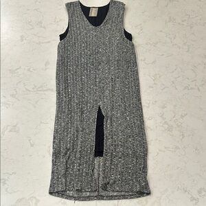 Chic gray midi dress with a textured finish. Features a sleeveless design and front slit.