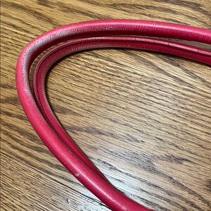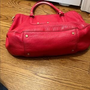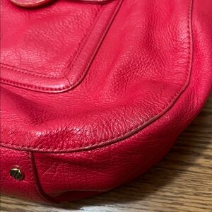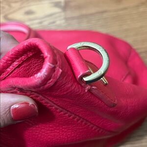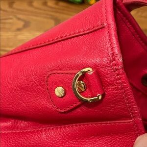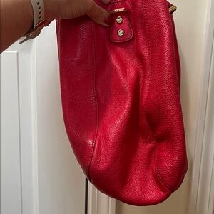 Tory Burch shoulder tote in vibrant reddish pink. Perfect for any occasion. Features high-quality leather and iconic logo.