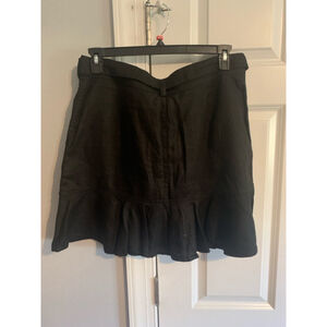 This is a Banana Republic black mini skirt, new with tags. The skirt features a button-down front with a decorative woven belt buckle. It has a ruffled hem and a fitted waistband with belt loops. The material appears to be linen or a linen blend. The skirt is in excellent condition, with no visible imperfections.