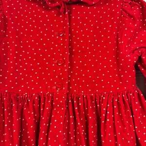 Bonnie Baby Red Polka Dot Corduroy Dress, 24 Months. This charming dress features a festive red corduroy fabric with white polka dots, perfect for holidays and special occasions. The chest area is beautifully adorned with intricate snowflake embroidery, adding a touch of winter wonder. It has a round neckline with a ruffled trim and button closure at the back for easy dressing. Long sleeves with elasticated cuffs complete the cozy design. Made from 100% cotton for the main dress with a lining of 65% polyester and 35% cotton, ensuring comfort and durability. Excellent pre-owned condition, ready for your little one's next festive event.