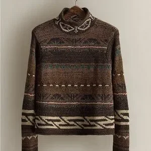 A stunning authentic Ralph Lauren vintage turtleneck, featuring rich brown tones and an intricate Southwestern-inspired knit pattern. This piece captures the brand’s iconic heritage Americana / Western luxury aesthetic that continues to trend with collectors and stylists.