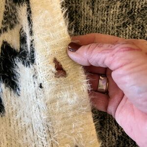 Stylish cardigan with a bold geometric pattern. Features black and cream colors. Perfect for layering. The top button hole has a tear. See all pics.