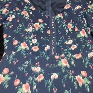 Stylish navy dress with vibrant floral design. Ideal for casual outings.