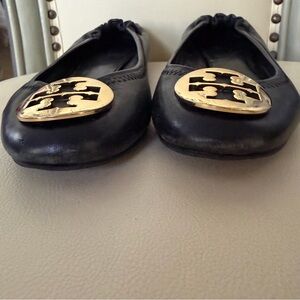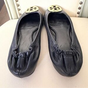 Elegant black flats with signature gold emblem. Perfect blend of style and comfort. The product is a pair of classic black leather ballet flats by Tory Burch, featuring a round toe, slip-on closure, and logo accents. These flats are designed for casual occasions in the summer, fall, and spring seasons. The high-quality leather lining and upper material ensure comfort and durability. With a solid black color and stylish logo detail, these ballet flats are a versatile and elegant choice for women looking for a chic and comfortable footwear option. Has visible flaws. Please zoom in photos. Sold as is.