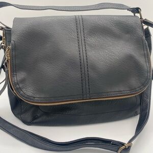 Black leather fold over shoulder bag with crossbody strap