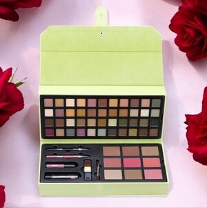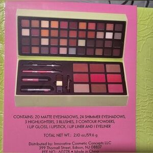 A full-face total make-up collection featuring matte, shimmer and metallic powders paired with neutral pink lip shades. Features 20 Matte eye shadows, 24 shimmer eye shadows, 3 highlighters, 3 blushes, 3 contour powders, 1 lip gloss, 1 lipstick, 1 lip liner and 1 eyeliner. Explore a vibrant range of colors with this versatile makeup palette. Perfect for creating stunning looks. New in tote and never opened. Smoke free home. Fast shipping!!