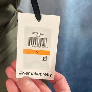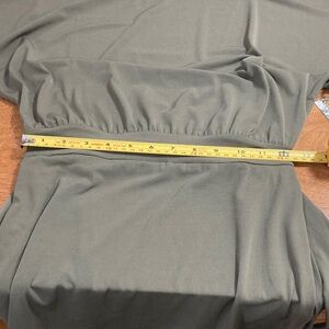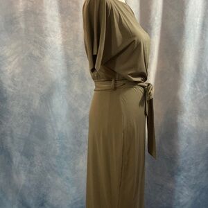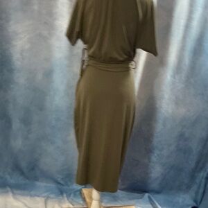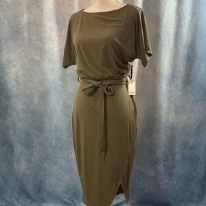 This is a NWT Kensie olive green shift dress, with a boatneck cut and short sleeves. It has an elastic waistband and a fabric belt to tie it with. The fabric has a comfortable jersey-like feel. Great business casual base piece.