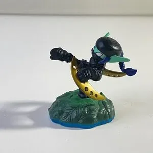 Loose Skylanders figure with base by Activision. Figure features a ninja character with green ear-like details and two curved blade-style weapons, standing on a green textured base with a blue edge. Molded plastic construction with painted details. Shows light wear consistent with normal handling and play. Includes figure and base only as shown.