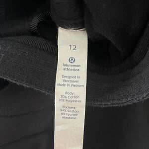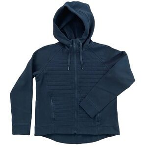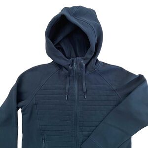 Women’s Lululemon Fleece Be True Hoodie. Black. Features a distinct quilted/ribbed panel on the front and a full zip closure. It's made from a soft cotton blend fleece fabric. Naturally breathable - feels thick, soft and comfortable. Front zip closure, drawstring hood and zippered pockets. Size 12. Great pre-loved condition.