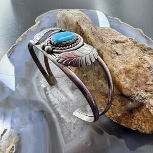 Beautiful Vintage Native American Silver Oval Turquoise Decorated Split Shank Flexible Bracelet For Women.