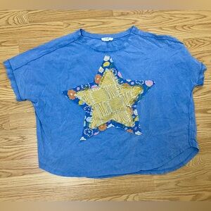 Vibrant blue tee featuring a large yellow star patch. Ideal for casual wear.