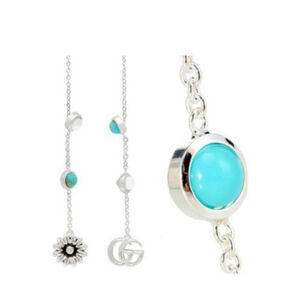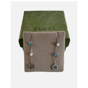 These Gucci earrings are a stunning statement piece, featuring the iconic Double G logo and beautiful stone accents. The sterling silver with an aged finish adds a touch of vintage charm. Perfect for adding a touch of luxury to any outfit. The mismatched design adds a unique and modern twist.
