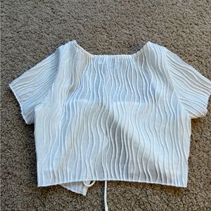 Stylish ivory crop top with textured fabric. Features a tie front and short sleeves. Perfect for casual outings.