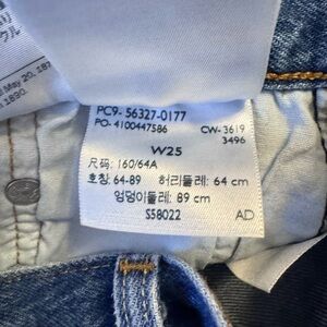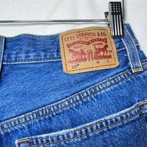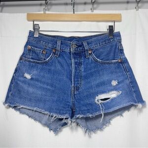 Levi’s 501 high waisted women’s denim shorts with a raw hem and mild distressing. Size 25 waist. Excellent condition with no flaws.