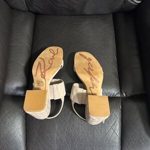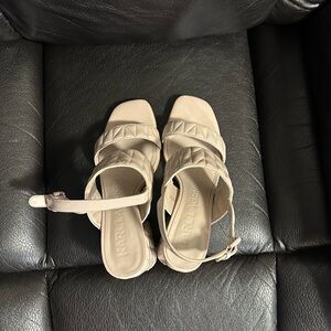 Gently used with minimal wear. Dune pink leather with quilted detailing, elegant open-toe design, perfect for dressy occasions.