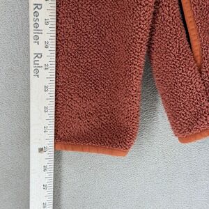 A vibrant color block hooded fleece jacket by Cotopaxi. This jacket features a quilted purple upper body and hood, contrasting with rust orange fuzzy fleece sleeves and lower body. A navy blue chest pocket with a red zipper detail adds a functional and stylish accent. The full zip front closure and integrated hood provide warmth and versatility.