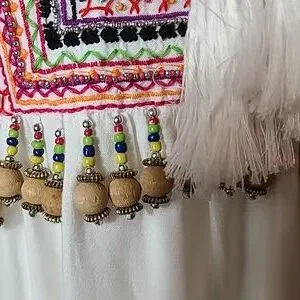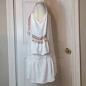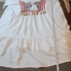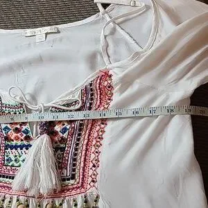 Ajustable Thin Straps, Cold Shoulder, Long Bell Ruffle Sleeves, Scoop Split Neck With Tassels, Flowy Body, Bodice and Sleeves are Embellished With Jewels, Beads, and Embroidery, White With Multicolor Beads and Embroidery, Size Small.