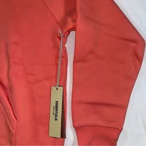 Bold coral hoodie with front pocket. Features Essentials branding. Comfortable and stylish.