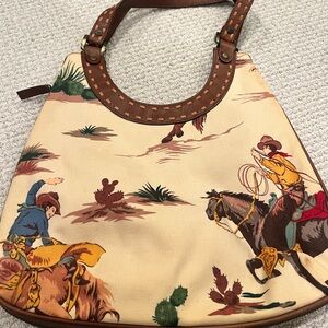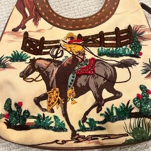 Stylish shoulder bag with a cowboy design. Features brown and cream tones. Perfect for adding a Western flair. Some marking at exterior. Measures 12.5x13x3